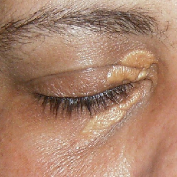 Os xantelasmas palpebrais são placas amareladas que se desenvolvem na pele em região periorbital